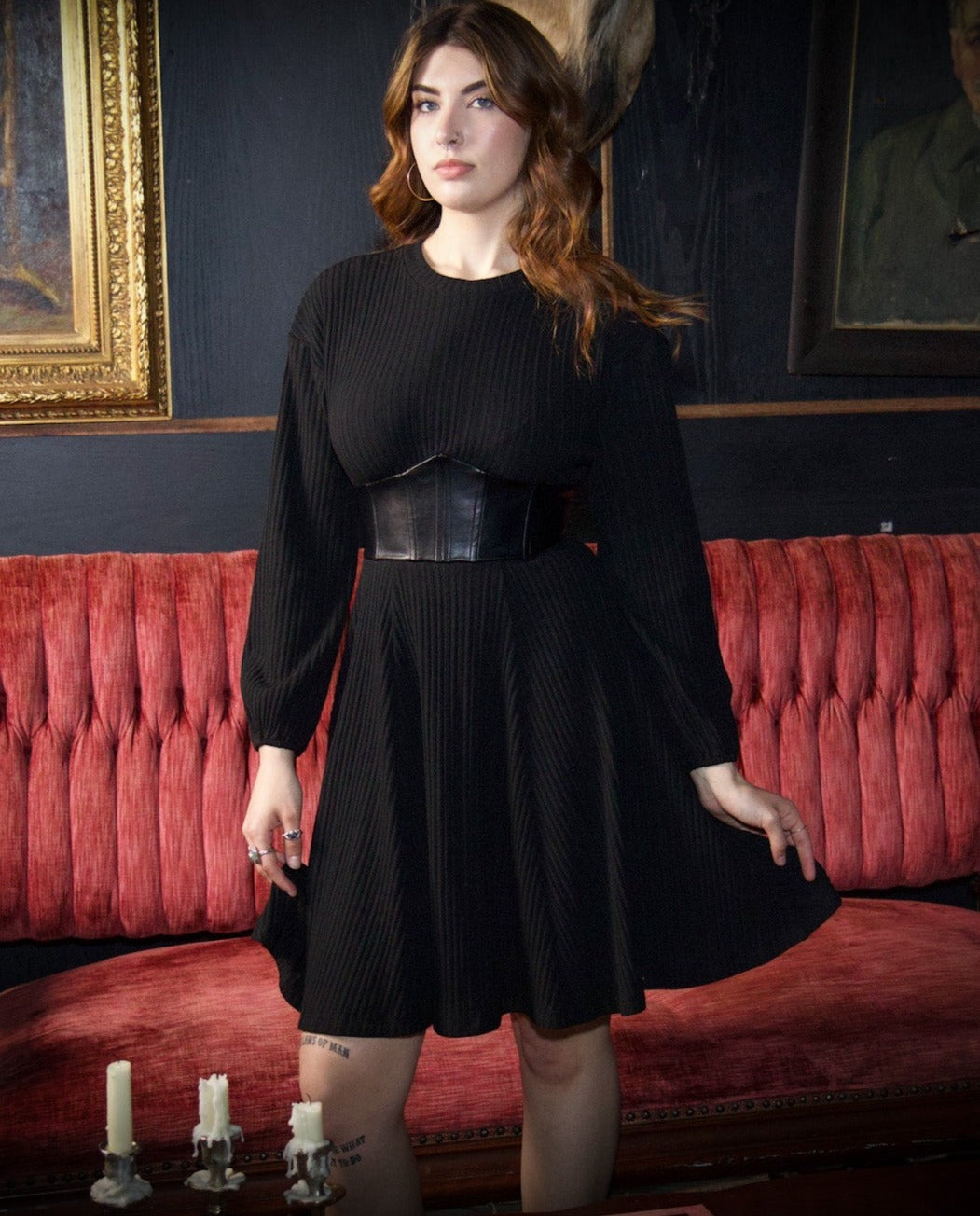 This sweater dress is made of super soft and stretchy sweater material with a vegan leather boned corset style waist. It features a lace up back waist to cinch in your curves and bring out the haunted ghoul in all!