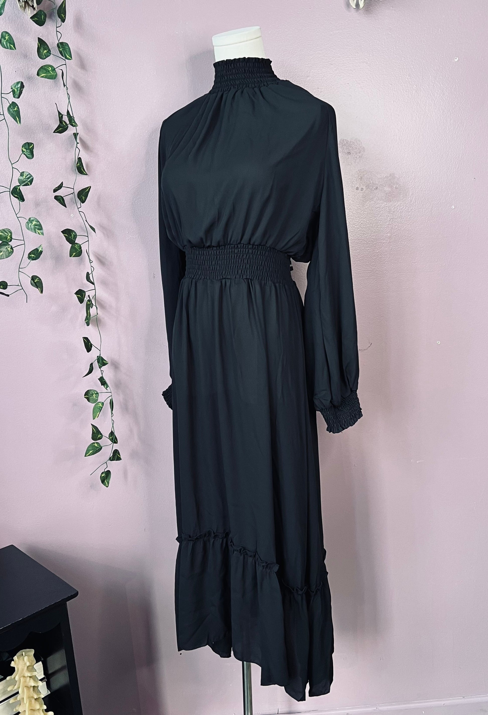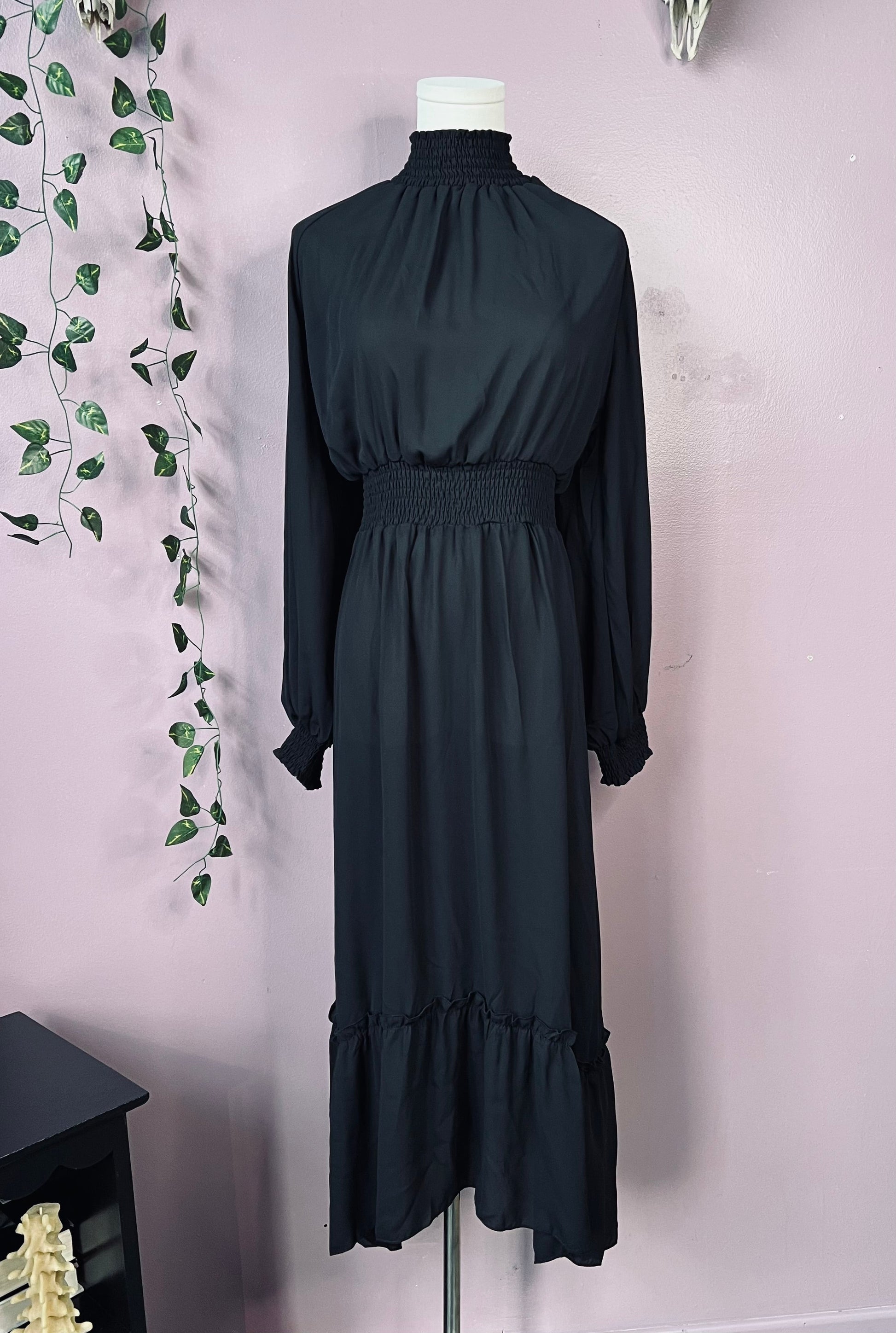 This dress is super lightweight and stretchy! Shirring at high neck, wrists and waist band to give you ultimate comfort and a relaxed boho look. Subtle high-low hem line and button closure at back neckline.