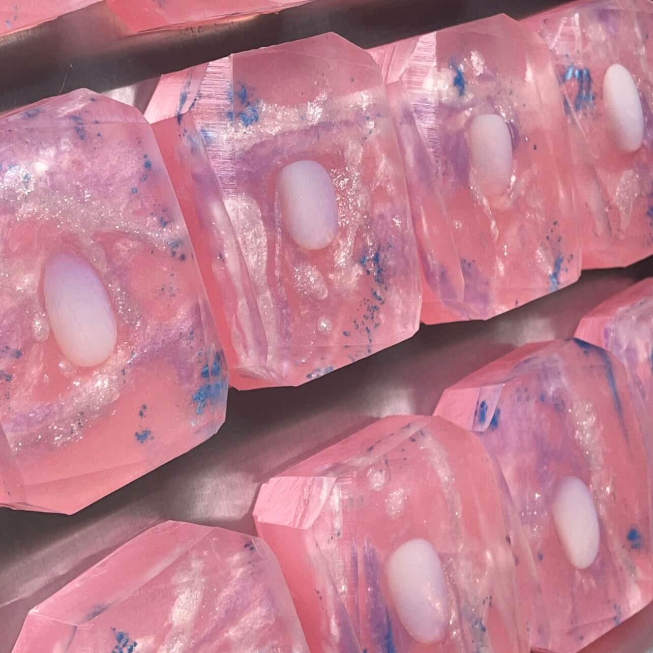 Ingredients: Sorbitol, Propylene Glycol, Sodium Laureth Sulfate, Stearic Acid, Water, Sodium Hydroxide, Myristic Acid, Sodium Cocoyl Isethionate, Glycerin, Lauric Acid, Titanium Dioxide, Kaolin Clay, Blue Mica, Pink Mica, Purple Mica, (Biodegradeable) glitter, Pink Amber fo, Vanilla fo