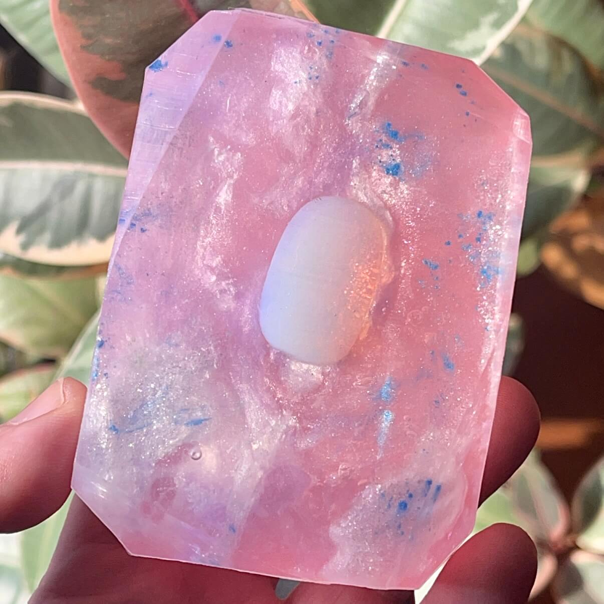 This bar is embedded with an Opalite Crystal. Known as the "Stone of Personal Power". This bar increases self-esteem and self-worth. Assists with any transitions. Improves communication and removes energy blockages. It instills persistence and gives us the strength to verbalize our hidden emotions. It also encourages success in business. Stimulates positive energy. This stone helps calm the soul by balancing energy with the universe.