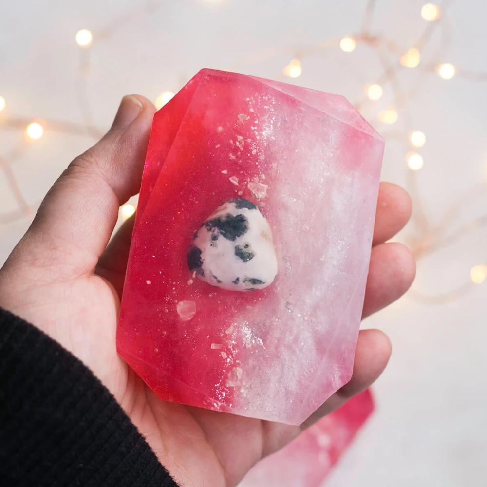This Holiday inspired bar is embedded with a Tree Agate crystal. Considered to be a Talisman, Tree Agate is a stone of inner peace. Tree Agate calms nerves, and can be combined with Clear Quartz to deepen meditation and prayer. Tree Agate brings our focus to the oneness of us all, dissolving egoism and arrogance. Brings abundance into your life. It clears blockages within your energy to open up the flow of money and prosperity. Deepens your connection with the earth.