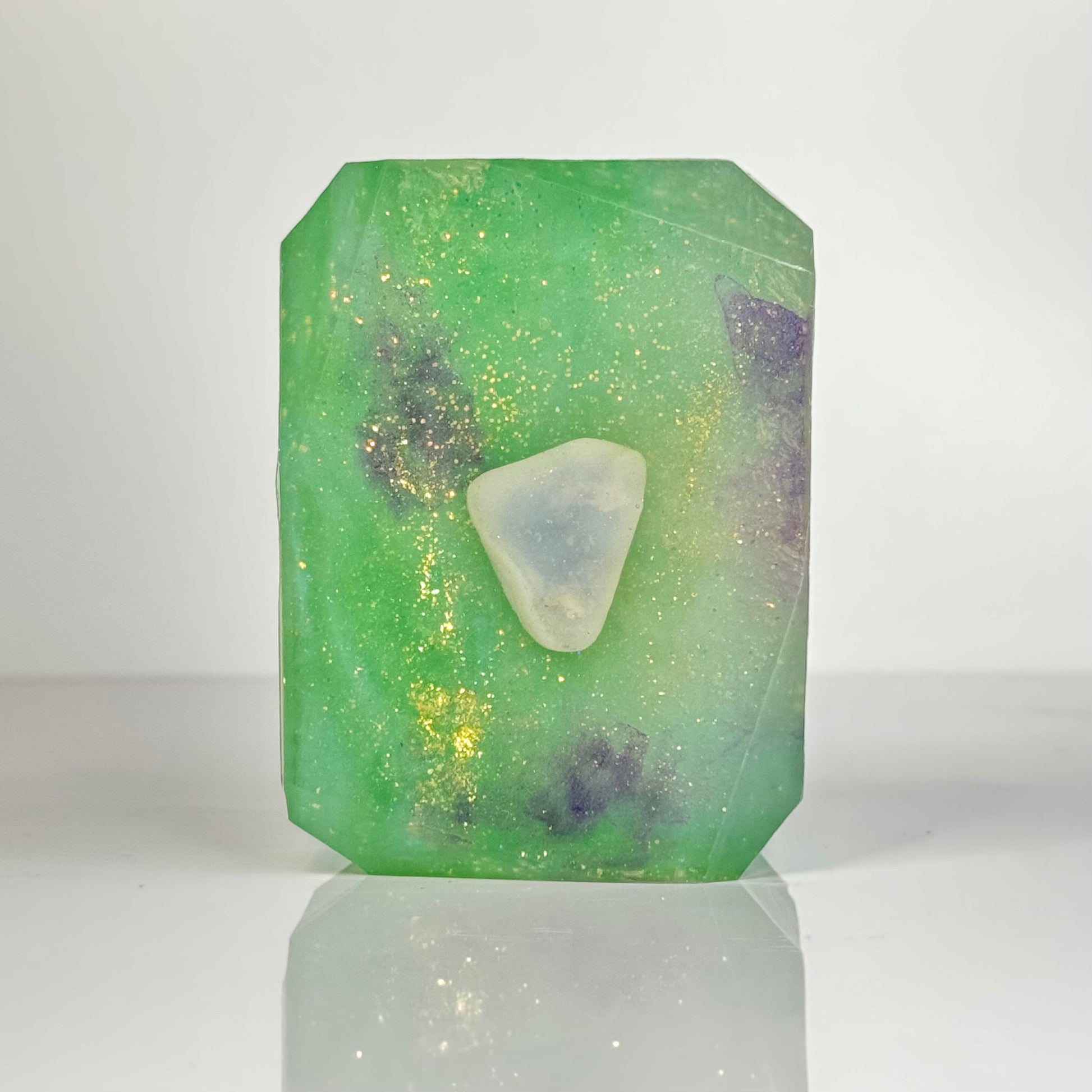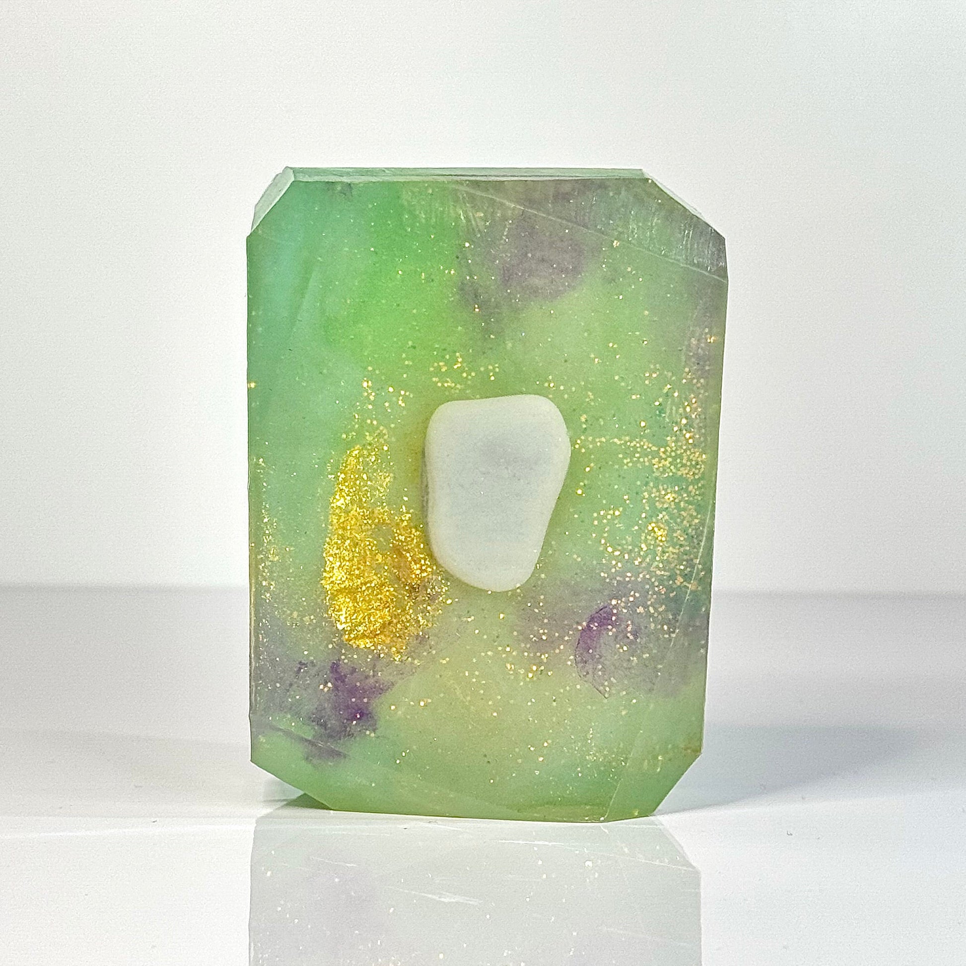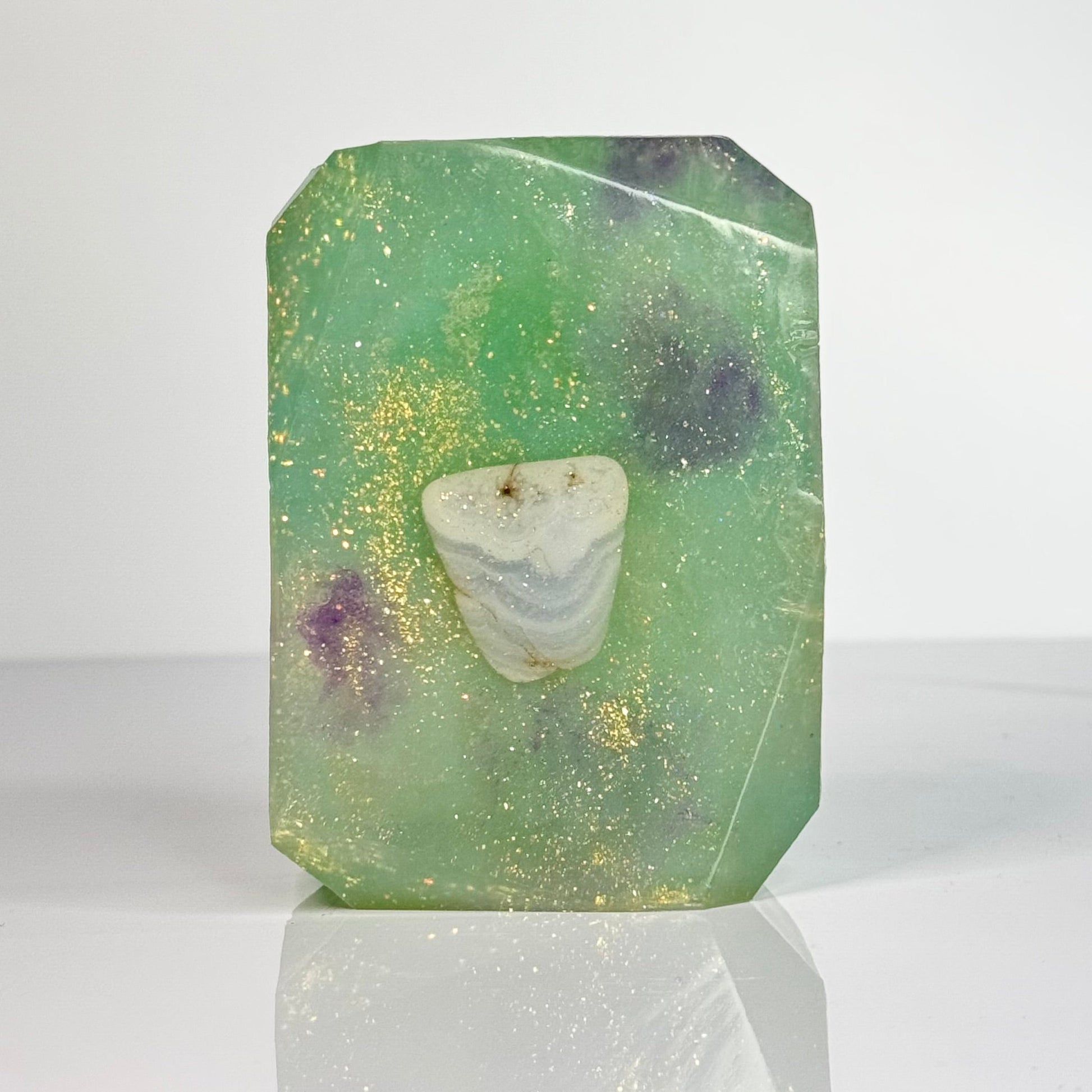 Meet "Psyche", Our new addition to our crystal soap collection, just in time for Valentines Day. This bar is embedded with a Blue Lace Agate. Which promotes encouragement and the flow of positive energy. Blue Lace Agate has a feminine energy and resonates with the Throat Chakra. It promotes clear communication, and helps you express your emotions with Clarity. Soothes an over active mind. Aids in stress relief & anxiety. Promotes compassion, peace & understanding. Blue Lace Agate is a Water Element stone. This helps provide its soothing energies and calming vibrations. Scented in a rich blend of Honey and Bourbon with notes of Orange Marmalade and Brown Sugar and Tobacco.