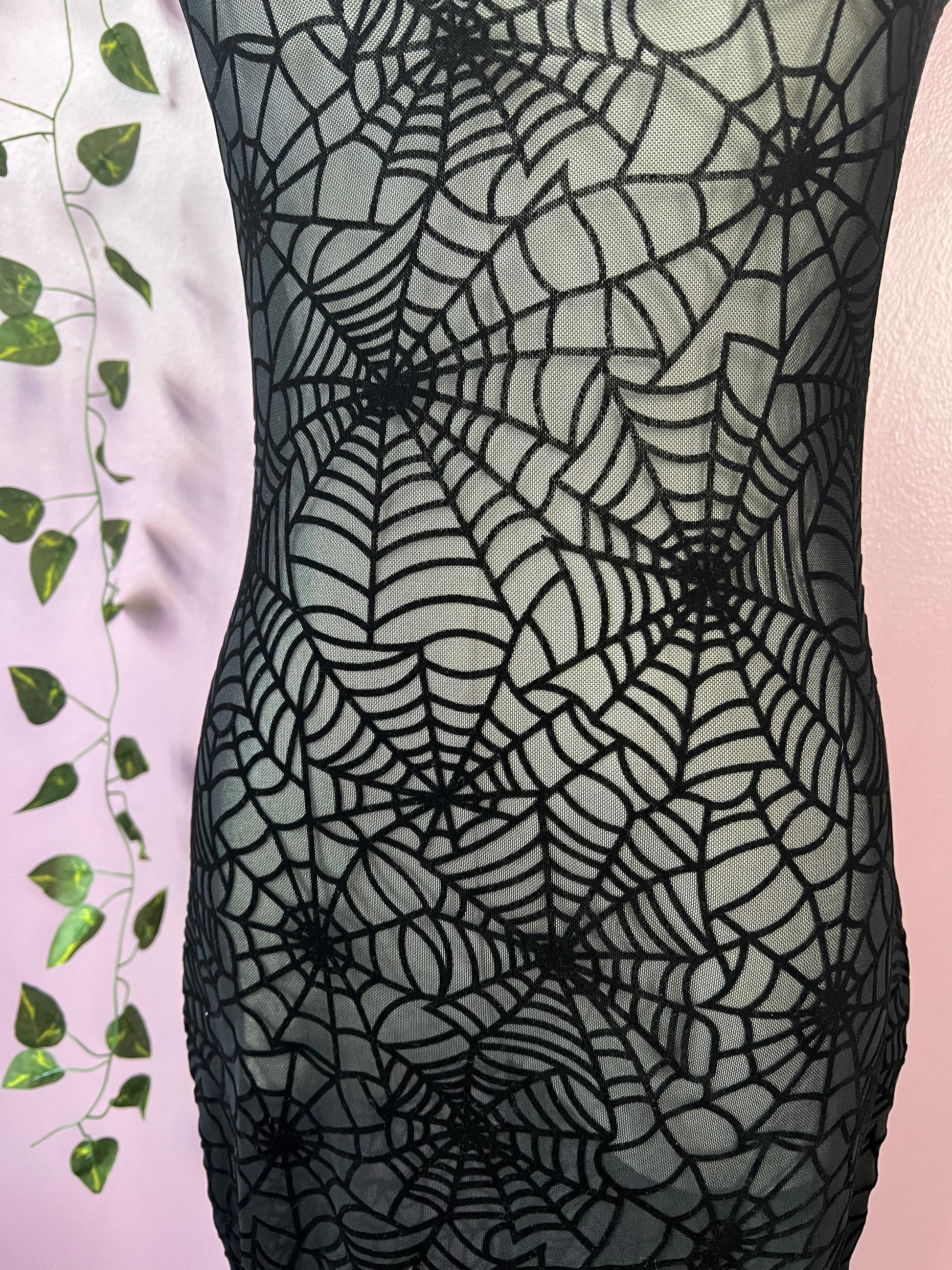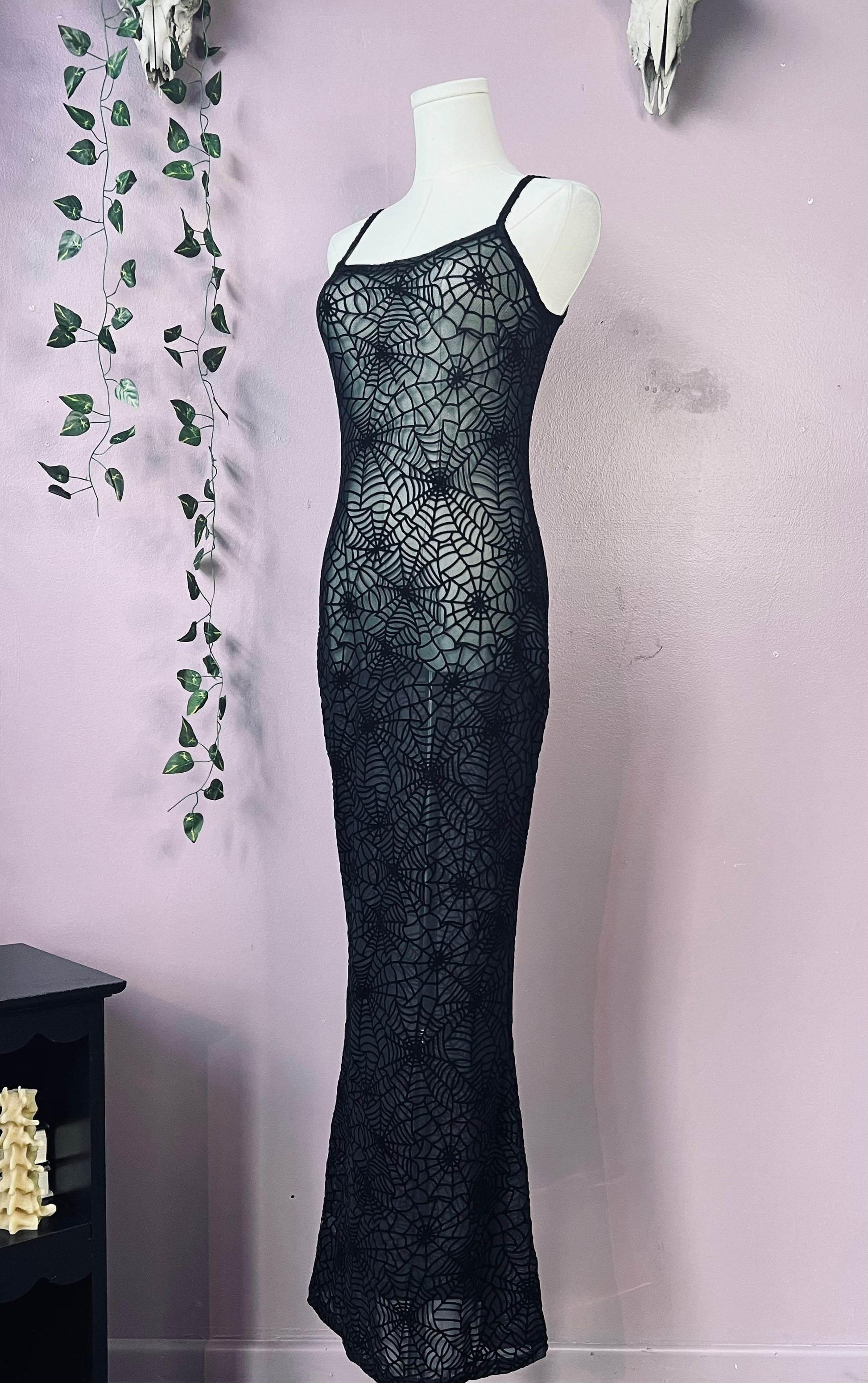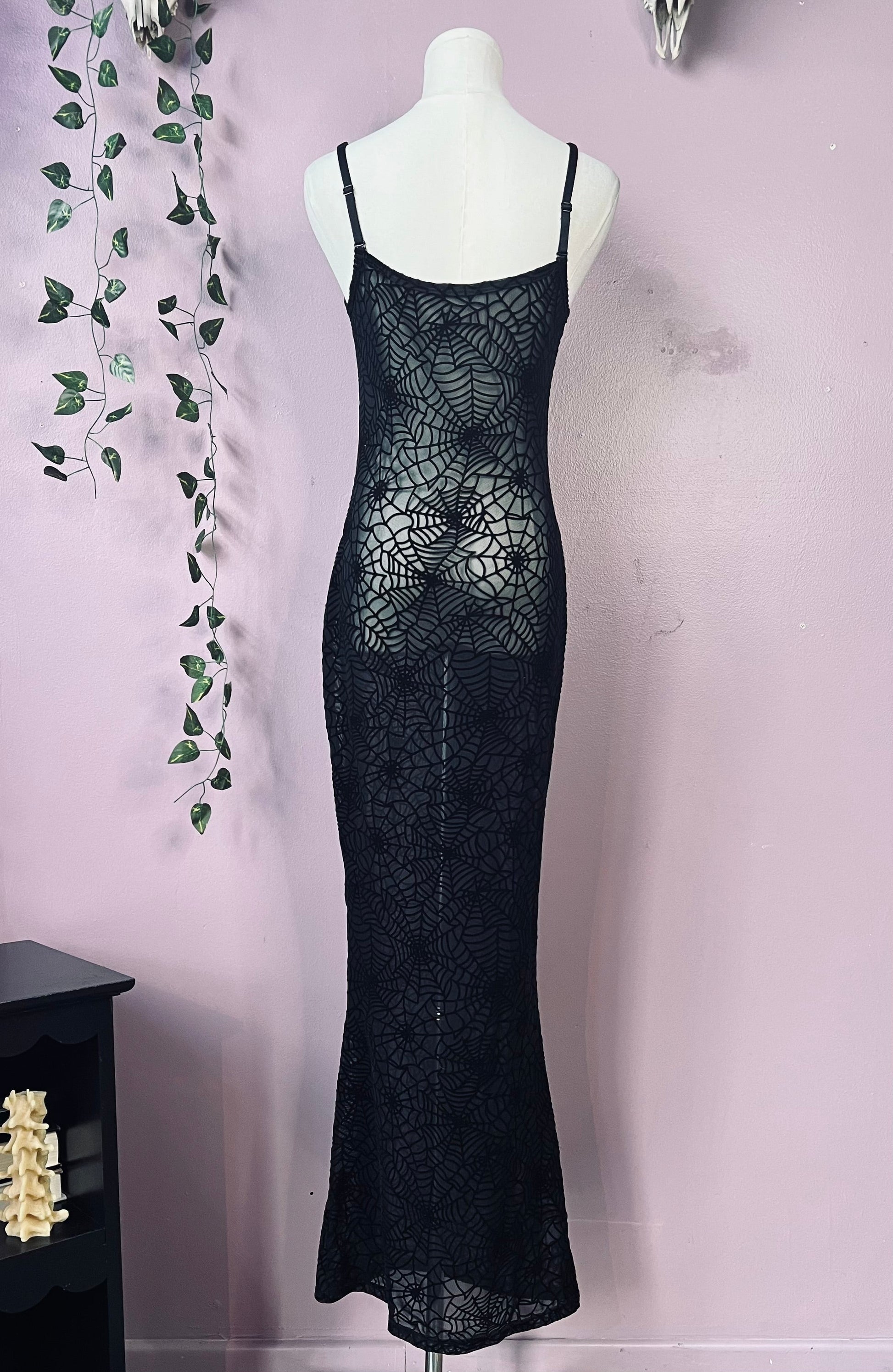 Sheer Hourglass Maxi Dress - Velvet Flocked Spider Webs - READY TO SHIP!